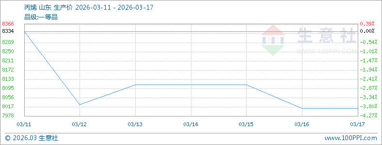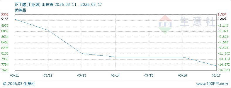 根据生意社商品行情分析系统显示,截止2026年3月17日,国内山东地区正丁醇参考价格7766元/吨,与3月11日(正丁醇参考价格8833元/吨),价格下调967元,跌幅12.08%。