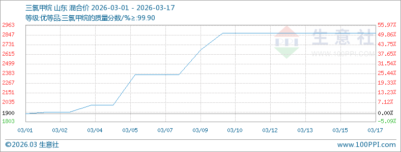 近日(3.1~3.17)山东地区三氯甲烷市场行情大幅上涨。据生意社商品行情分析系统显示,截至3月17日山东地区三氯甲烷散水价格在2866元/吨,较月初的1900元/吨上涨了50.88%。中东地缘冲突扰动石化产业链,三氯甲烷原料甲醇大幅走高及液氯先涨后跌过山车式行情均推动三氯甲烷价格大幅上行。