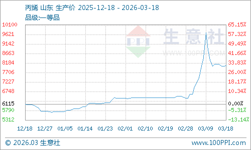 本周丙烯酸市场呈现先冲高、后回落、再企稳的脉冲式波动走势,价格围绕12750元/吨区间展开博弈。生意社数据显示,3月11日丙烯酸华东优等品基准价为12750元/吨,周初至3月12日快速上行至阶段高点13076元/吨,涨幅达2.56%;3月15日价格快速回落至12750元/吨,回吐全部阶段性涨幅;3月16日至18日价格企稳,与上周初价格持平,整体维持区间整理运行态势。