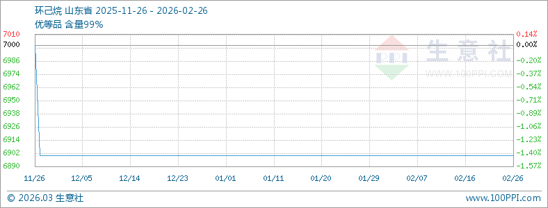 根据生意社监测的数据显示,截止2月26日,国内工业级优等品环己烷均价在6900元/吨,近期市场供需相对平衡,价格波动幅度较小,短期内预计以稳中窄幅整理为主。