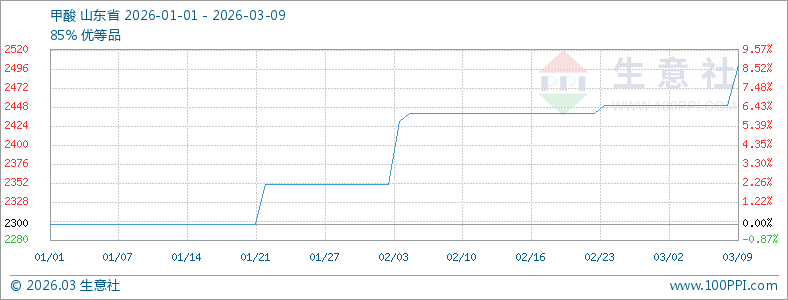 据生意社商品行情分析系统显示:近日甲酸价格出现上扬,截至3月9日生意社85%工业级甲酸基准价2500元/吨,较上周同期(3月2日)上涨2.04%,环比上涨2.46%,同比下跌18%。