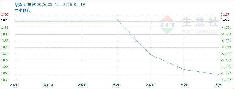 据生意社商品行情分析系统,截止3月19日,国内山东地区尿素市场参考均价为1865元/吨,较3月13日市场参考均价1892元/吨,国内尿素市场价格下跌1.45%。