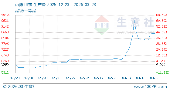 3月中下旬国内环氧丙烷市场呈上涨态势,此轮上涨呈现出涨势急、幅度大的特点,主要受成本推动、供应收缩等因素共同驱动。据生意社监测系统显示,截止3月23日,生意社环氧丙烷基准价为11466.67元/吨,与1日相比,上涨了43.33%。
