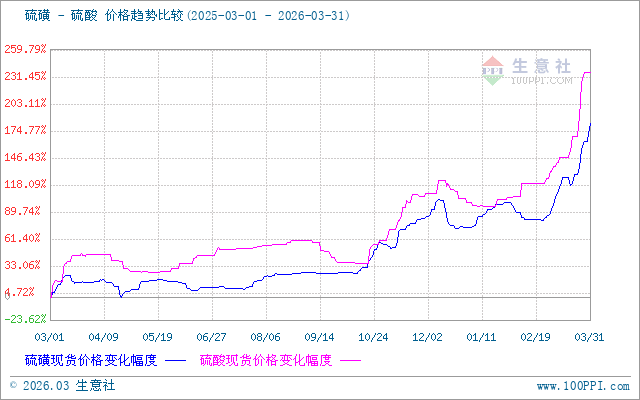 2026年3月,国内硫酸市场延续强势上行态势,价格快速攀升并创下阶段性新高。截至3月31日,生意社硫酸基准价达1580.00元/吨,较月初上涨49.41%,同比上涨3%,市场呈现“量价齐升、货源紧俏”格局。