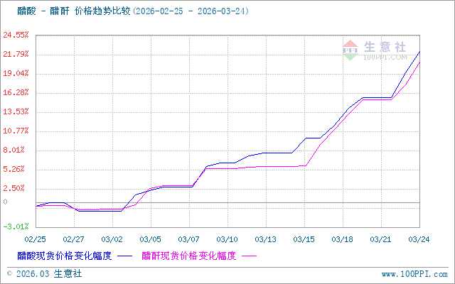 据生意社商品行情分析系统,截止3月24日,醋酸市场均价在3443.33元/吨,与3月16日价格3093.33元/吨相比,上调350元/吨,涨幅11.31%。