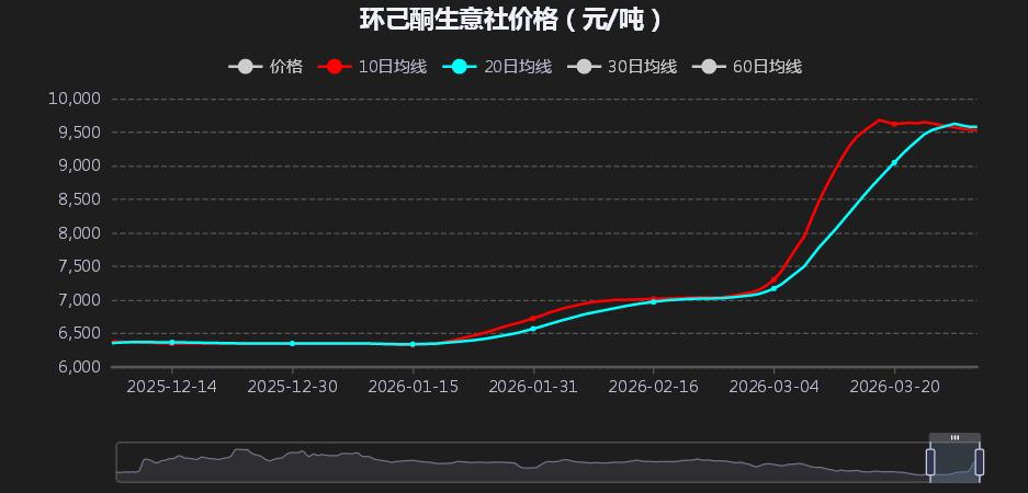 需求端,进入春季,环己酮下游己二酸、尼龙66等化纤及涂料行业进入传统旺季,叠加前期低价原料的补库需求释放,上旬刚需采购明显增加,对价格形成一定支撑。但是,随着价格快速冲高至万元附近,下游企业成本压力陡增,采购意愿快速降温,中旬后以按需小单采购为主,高价货源承接不足,是价格阶段性冲高后回落的重要原因。