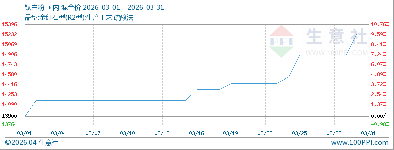 以国内市场走货量较大的硫酸法金红石型钛白粉为例,根据生意社数据监测显示,3月国内钛白粉市场价格上涨,3月1日钛白粉均价为13900元/吨,3月31日钛白粉均价为15260元/吨,价格上调9.78%。