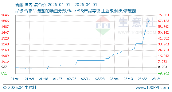 进入4月,国内无水氟化氢(AHF)市场迎来了一轮显著的强势上涨行情。根据最新市场数据,氟化氢4月份江浙地区送到价格环比上月大幅上涨了1500元/吨。此次价格跳涨的核心驱动力主要来自于成本端的强力推动。据生意社分析系统显示,截止4月1日,生意社氢氟酸基准价为14666.67元/吨,较上月末上涨11.39%。