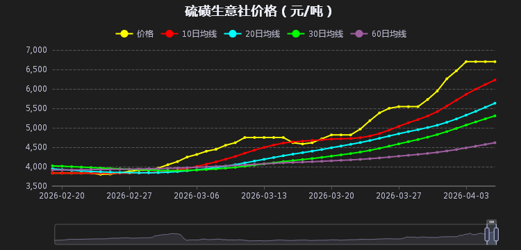 据生意社数据显示:截至4月7日,生意社硫磺基准价为6700.00元/吨,与本月初(5943.33元/吨)相比,上涨了12.73%。;自3月中旬启动上涨以来,涨幅超70%,创历史新高。