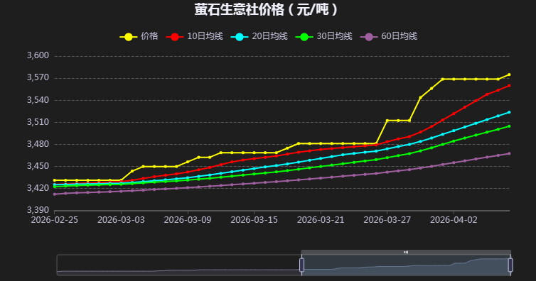 下游无水氢氟酸市场同步走强,主流送到价涨至14000-14500元/吨,部分企业装置重启、开工率回升,对萤石原料的刚需采购增加。虽氢氟酸企业受硫酸等辅料涨价影响,利润空间被压缩,对高价萤石采购偏理性,但旺季备货需求逐步释放,刚需支撑下萤石成交重心稳步上移,下游涨价进一步传导至上游原料端。