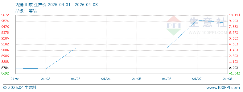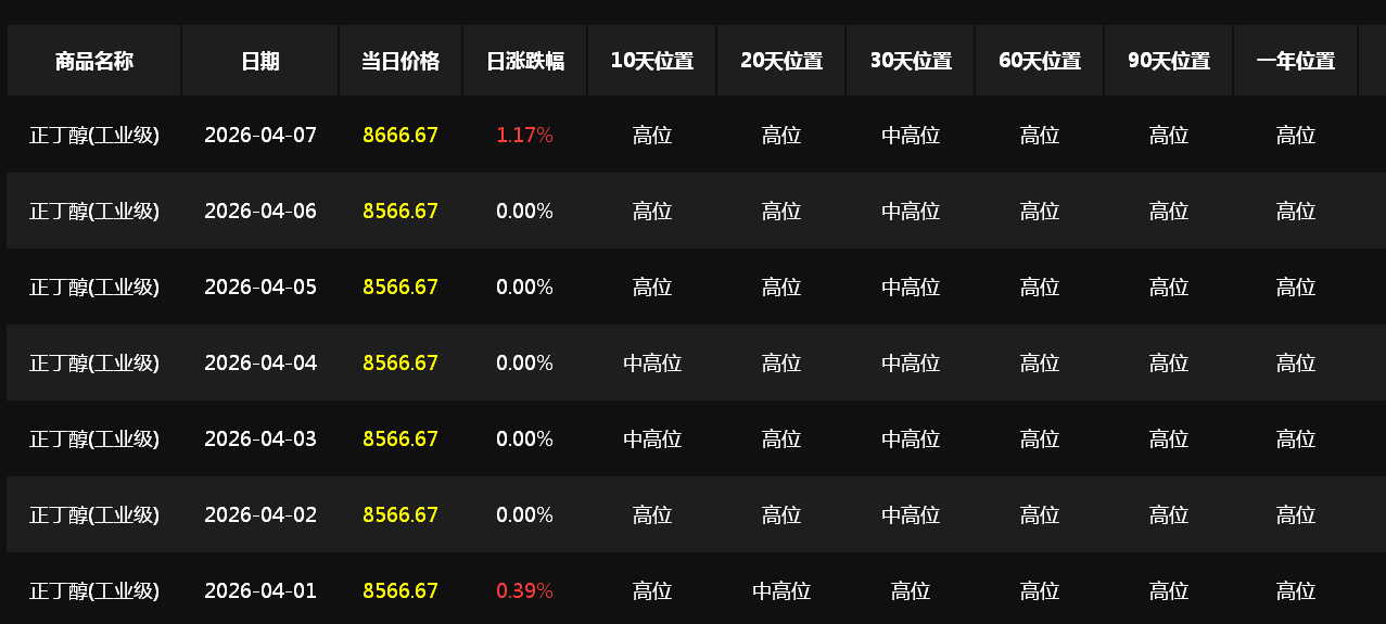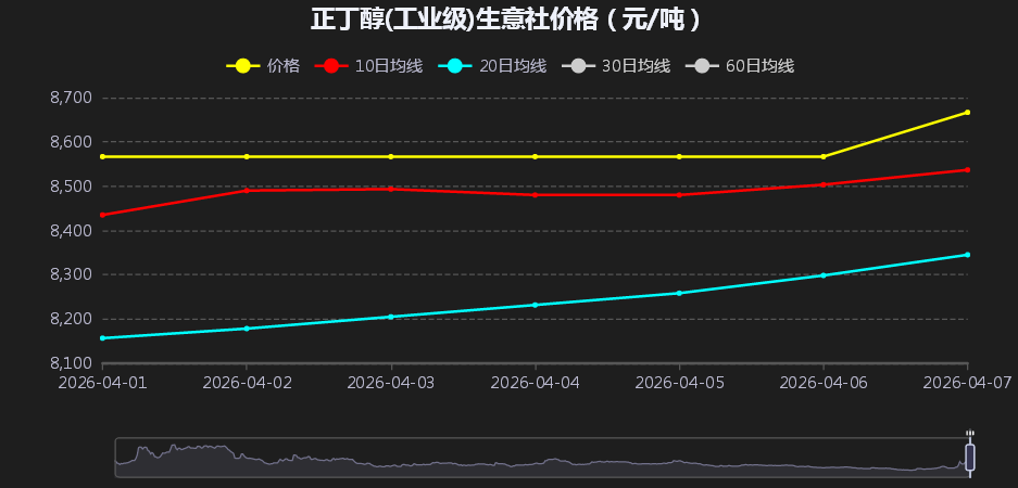 根据生意社商品行情分析系统显示,截止2026年4月8日,国内山东地区正丁醇参考价格8933元/吨,与4月1日(正丁醇参考价格8566元/吨),价格上调367元,涨幅4.28%。
