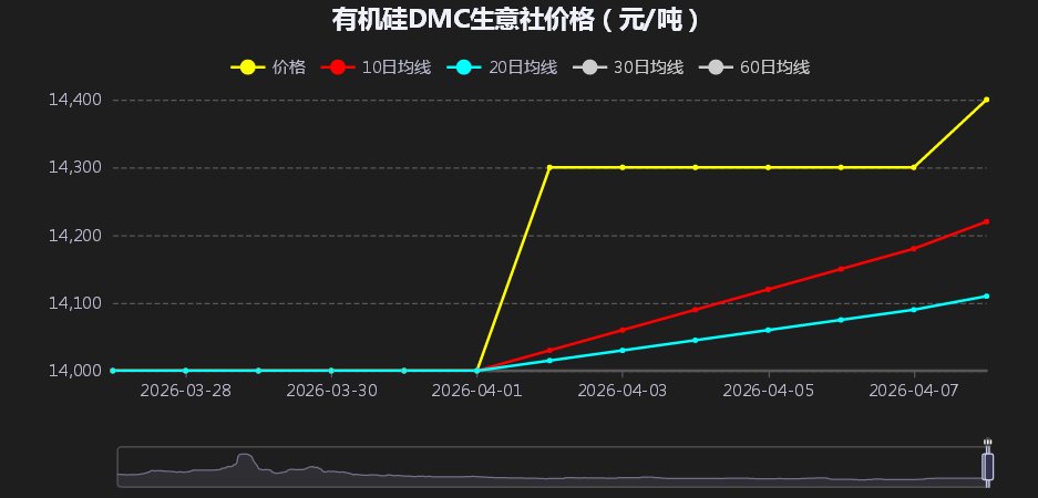 据生意社商品行情分析系统显示,2026年4月8日,有机硅DMC价格参加14400元/吨,4月1日,有机硅DMC价格参考14000元/吨,价格上调400元/吨,涨幅2.86%。