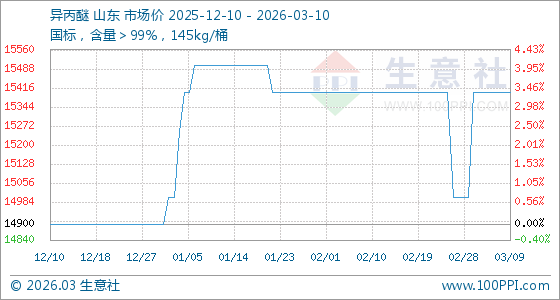 3月10日,生意社异丙醚基准价为15400.00元/吨,与本月初(15000.00元/吨)相比,上涨了2.67%。