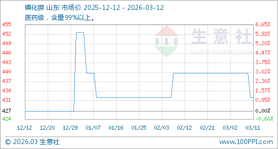 3月12日生意社碘化钾基准价为432.00元/公斤