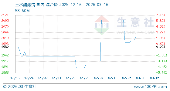3月16日,生意社三水醋酸钠基准价为2025.00元/吨,与本月初(2012.50元/吨)相比,上涨了0.62%。