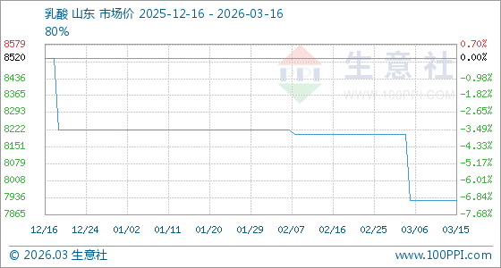 3月16日,生意社乳酸基准价为7925.00元/吨,与本月初(8200.00元/吨)相比,下降了3.35%。
