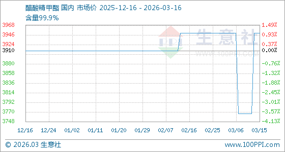 3月16日,生意社醋酸精甲酯基准价为3950.00元/吨,与本月初持平。