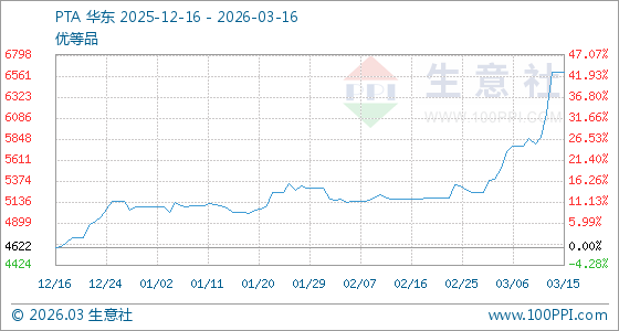 3月16日,生意社PTA基准价为6600.60元/吨,与本月初(5237.90元/吨)相比,上涨了26.02%。