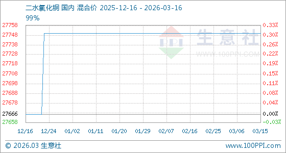 3月16日,生意社二水氯化铜基准价为27750.00元/吨,与本月初持平。
