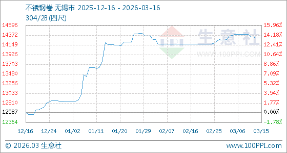 3月16日生意社不锈钢卷基准价为14312.50元/吨