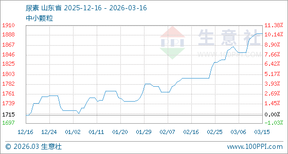 3月16日,生意社尿素基准价为1892.50元/吨,与本月初(1836.25元/吨)相比,上涨了3.06%。