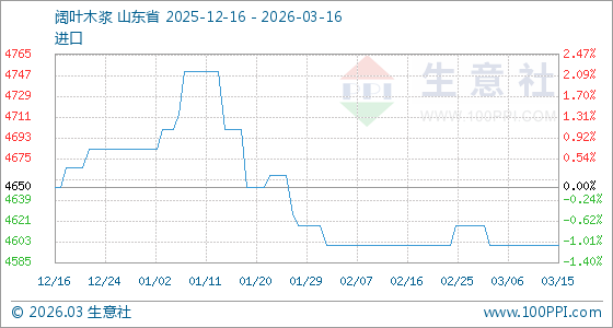 3月16日生意社阔叶木浆基准价为4600.00元/吨
