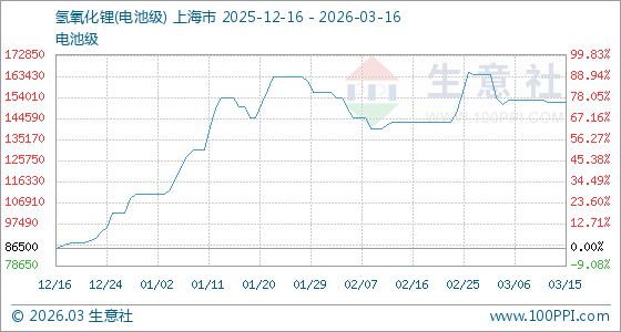 3月16日生意社氢氧化锂(电池级)基准价为152000.00元/吨