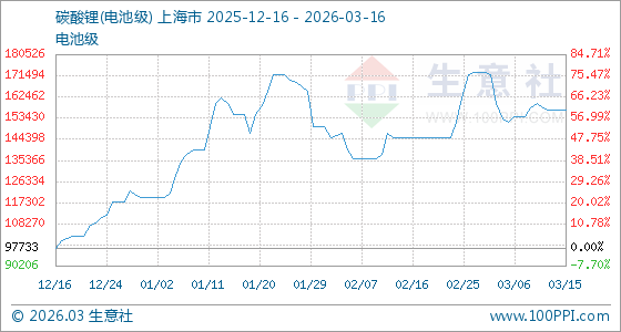 3月16日生意社碳酸锂(电池级)基准价为157000.00元/吨