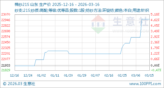 3月16日,生意社棉纱21S基准价为22966.67元/吨,与本月初(22433.33元/吨)相比,上涨了2.38%。