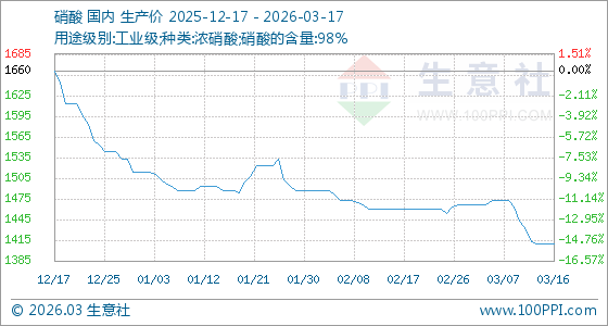 3月17日,生意社硝酸基准价为1410.00元/吨,与本月初(1466.67元/吨)相比,下降了3.86%。