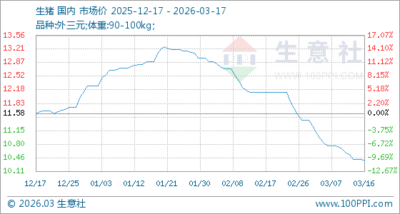 3月17日,生意社生猪基准价为10.40元/公斤,与本月初(11.40元/公斤)相比,下降了8.77%。