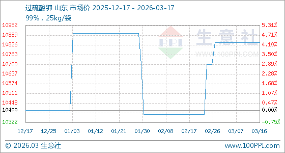 3月17日,生意社过硫酸钾基准价为10840.00元/吨,与本月初持平。