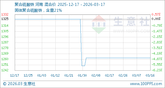 3月17日,生意社聚合硫酸铁基准价为1262.50元/吨,与本月初持平。