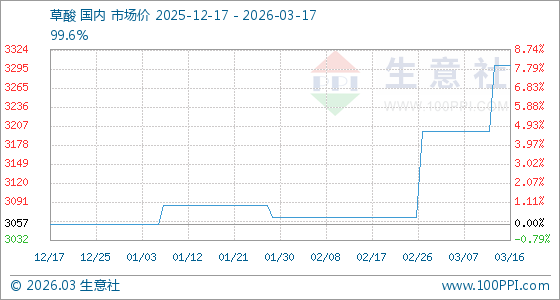 3月17日,生意社草酸基准价为3300.00元/吨,与本月初(3200.00元/吨)相比,上涨了3.12%。