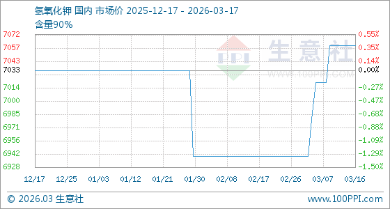 3月17日,生意社氢氧化钾基准价为7060.00元/吨,与本月初(6940.00元/吨)相比,上涨了1.73%。
