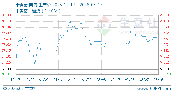 3月17日,生意社干香菇基准价为57.73元/公斤,与本月初(58.05元/公斤)相比,下降了0.55%。