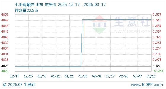 3月17日,生意社七水硫酸锌基准价为4850.00元/吨,与本月初持平。