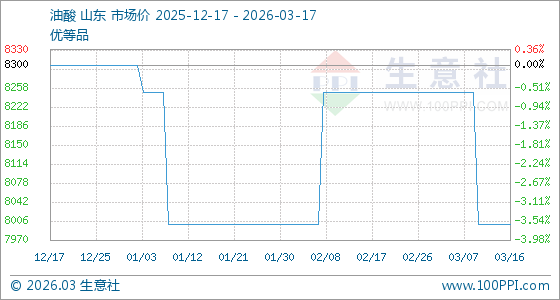 3月17日,生意社油酸基准价为8000.00元/吨,与本月初(8250.00元/吨)相比,下降了3.03%。