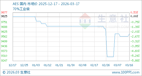 3月17日,生意社AES基准价为9600.00元/吨,与本月初(9300.00元/吨)相比,上涨了3.23%。