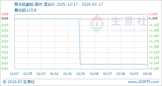 3月17日,生意社聚合硫酸铝基准价为1012.50元/吨,与本月初持平。