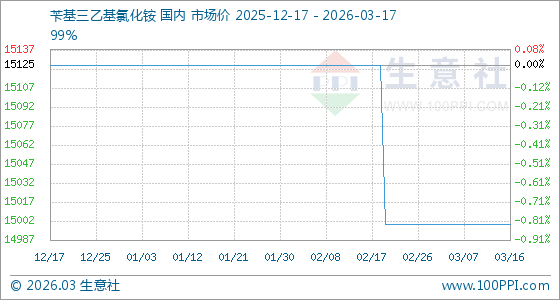 3月17日,生意社苄基三乙基氯化铵基准价为15000.00元/吨,与本月初持平。