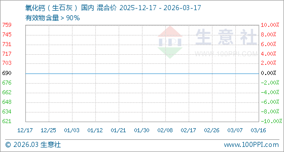 3月17日,生意社氧化钙(生石灰)基准价为690.00元/吨,与本月初持平。
