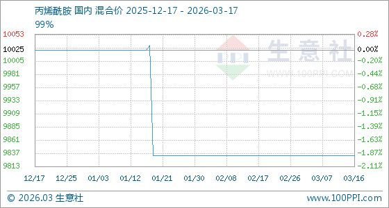 3月17日,生意社丙烯酰胺基准价为9833.33元/吨,与本月初持平。
