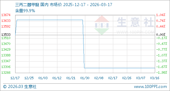 3月17日,生意社三丙二醇甲醚基准价为13300.00元/吨,与本月初持平。