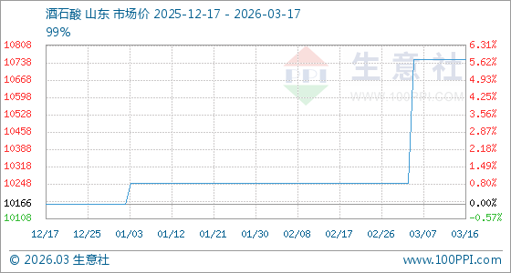 3月17日,生意社酒石酸基准价为10750.00元/吨,与本月初(10250.00元/吨)相比,上涨了4.88%。