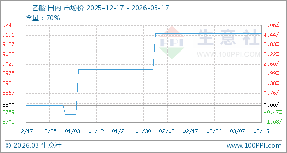 3月17日,生意社一乙胺基准价为9200.00元/吨,与本月初持平。