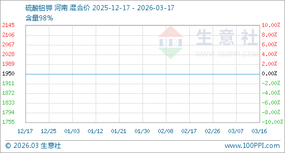 3月17日生意社硫酸铝钾基准价为1950.00元/吨