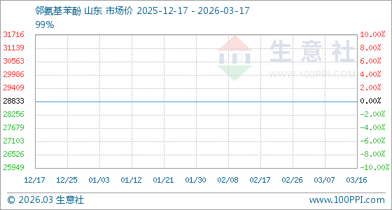3月17日,生意社邻氨基苯酚基准价为28833.33元/吨,与本月初持平。