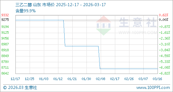 3月17日,生意社三乙二醇基准价为8700.00元/吨,与本月初持平。