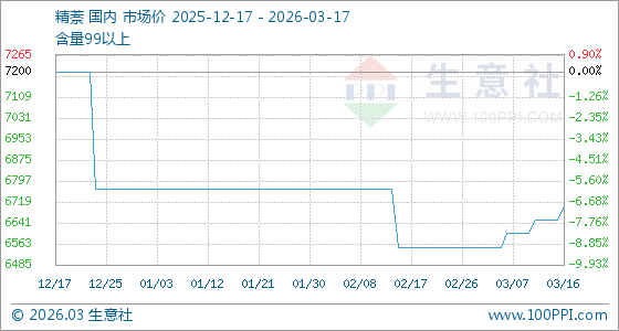 3月17日,生意社精萘基准价为6700.00元/吨,与本月初(6550.00元/吨)相比,上涨了2.29%。